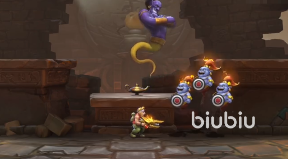 1、该游戏中的金币关卡也叫作“灯神试炼”,这就是一个纯粹的打金币打分数的关卡,但是金币奖励却非常的丰富。在该模式的一开局就能够看到一个灯神,直接向其进行攻击就好,地图中会有一些位置方便大家进行输出,别忘了踩上去。