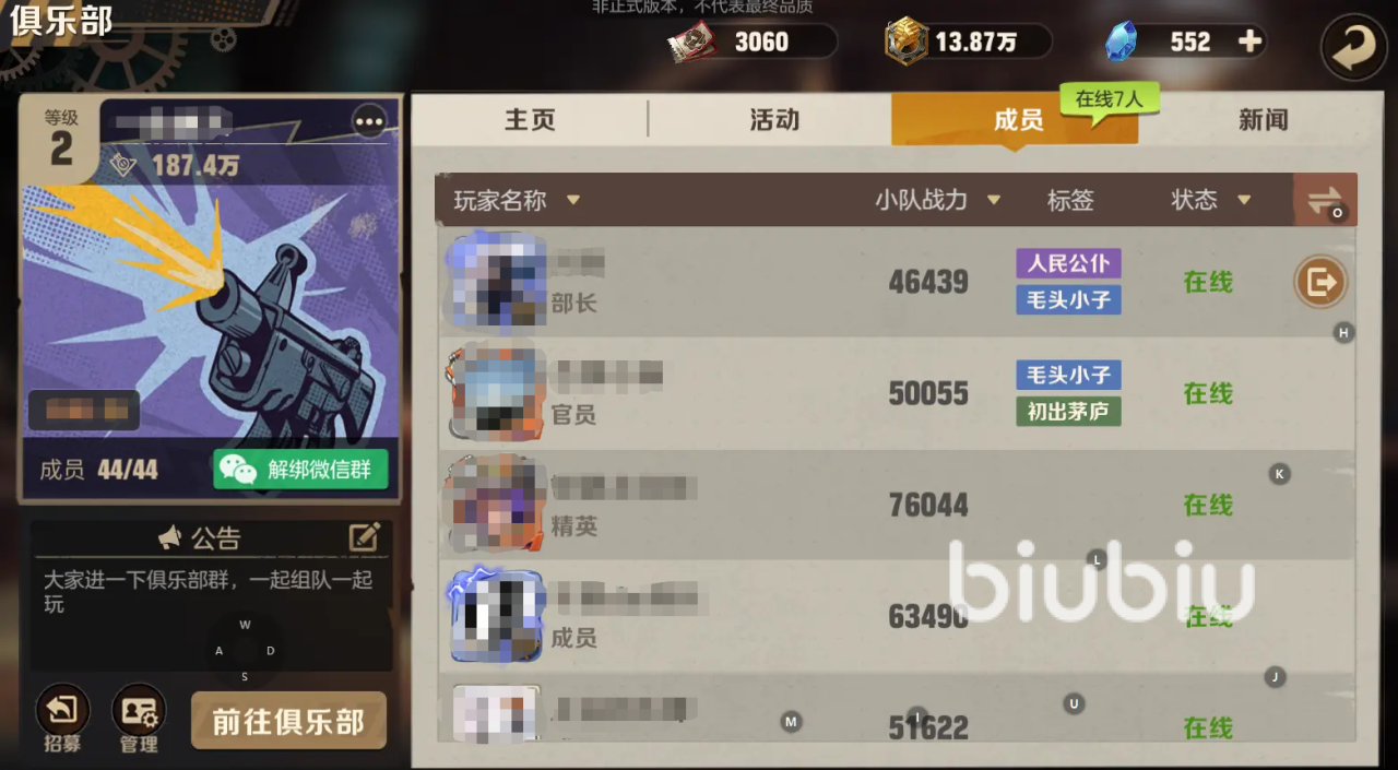 2、在进入战场之前,需要玩家先编配好小队,因为在之后就无法再次更换角色、武器、顺序。在进入战场后,玩家可以玩家可以看到其他俱乐部的玩家,此时可以自行寻找对手进行挑战,不过要注意挑战次数有上限的。