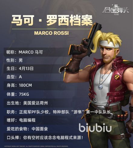 首先就是最为经典的角色马可罗西,一米八的身高下体重有75kg,浑身的肌肉线条非常明显,是一个妥妥的肌肉猛男,其标志性的黄色头发让每一个见过他的小伙伴都无法忘记,加上充满魅力的眼神以及几道无法恢复的伤痕,让这个角色多了一些男性魅力,整体的建模造型还是比较帅气的,在游戏里马可是军队中的队长,却对ai编程独有情钟,喜欢将自己写的程序发布到网站上,然后和别的爱好者进行挑战pk,马可最讨厌的事情就是在餐厅吃饭的时候前面有很多人排队,这会严重影响马可的干饭环境。由于马可在军队中的突出表现以及对计算机领域的了解,荣获了部队颁发的智能士兵称号,让很多人羡慕不已,在军队中马可也有一个名叫塔马的好朋友,并在之后是一对出生入死的好兄弟。