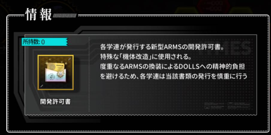 (1)开发许可证:各校联合力量开发出的新型ARMSOD开发许可证。机体改造所使用的必须道具。由于反复ARMS的变装而给DOLLS带来的精神负担各学联应慎重发行该文件。