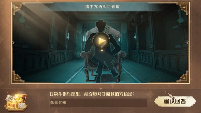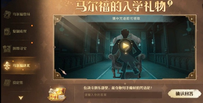 在活动界面大家可以看到马尔福的入学礼物活动,只要正确输入其答案我们就可以获得一些丰富的奖励。而谜题是在决斗俱乐部里,能够夺取对方魔杖的咒语是什么。只要看到哈利波特原著系列小说或者是改编电影系列的小伙伴都知道这个咒语就是除你武器了。我们在游戏的下方输入除你武器这四个字再点击右侧的确认回答就可以了。