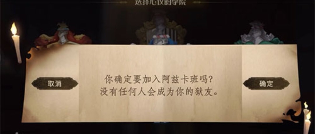 第一个方法:就是玩家在选择心仪的学院这个界面,然后四个学院都看完一遍了,然后在打一直点击这个最右边学院的图标,就是阿兹卡班了。不过阿兹卡班不是玩家一次就能加入的,因为它其实是个彩蛋,玩家可以一直点击转动,多次试验。成功后,就会出现这个阿兹卡班,随后还会提示玩家是否加入,玩家点击加入即可成为阿兹卡班的一名狱友啦!
