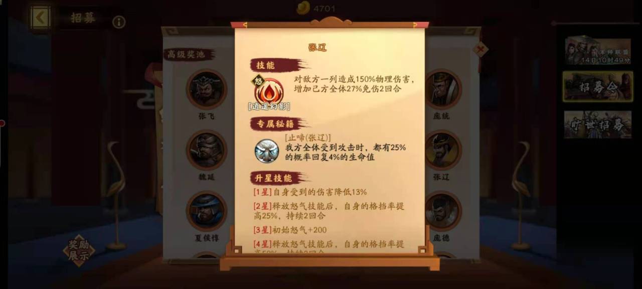张辽的专属秘籍激活之后可以增加止啼技能,效果是在我方全体武将受到攻击的时候,有几率恢复自身4%的血量,这个效果使得张辽可以客串治疗的位置,所以张辽更像是一个辅助武将,有了张辽的话,队伍中可以把治疗武将的位置空出来,这样队伍里的伤害就更足了。但从技能方面分析的话,小编是推荐大家来使用张辽的,而且前期就能见到效果,不需要培养很久就能使用。
