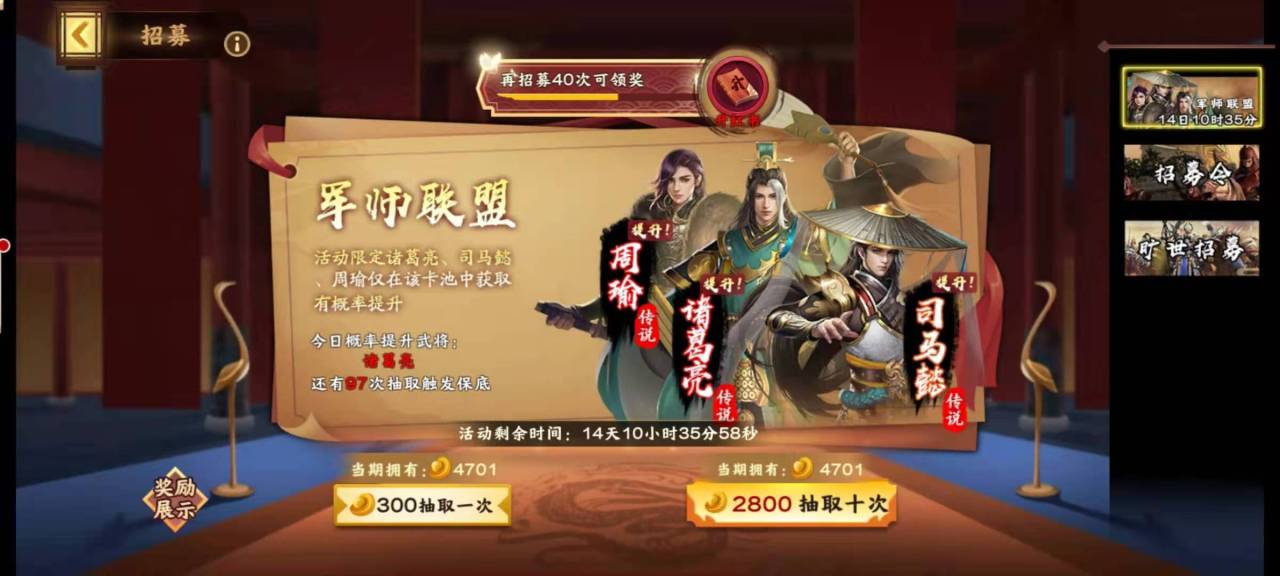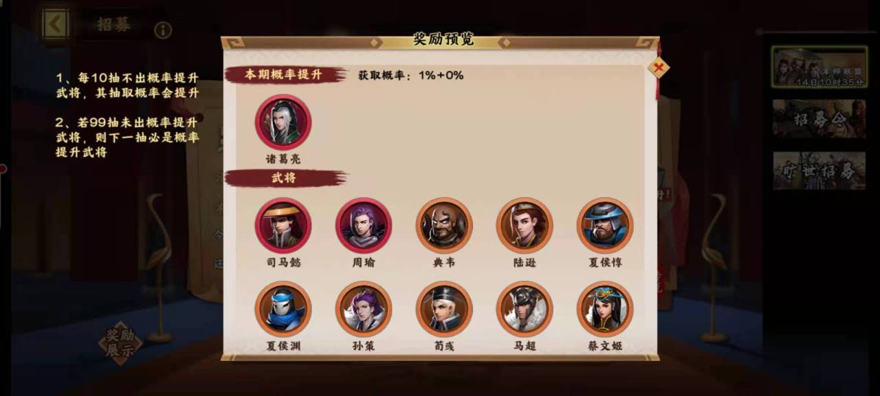 招募武将主要是依靠酒馆抽取和碎片合成两项,其中酒馆是重点,使用招募券和元宝可以进行十连抽,每次必得一名橙色武将,小编建议大家最少进行4次十连抽,这样才有足够的武将去组成基本的队伍。其他的就靠碎片积累了,在推图中就可以得到武将碎片,抽奖的时候也有碎片,集齐了100枚碎片就能召唤出武将了,前期填满了三个队伍就算合格了。