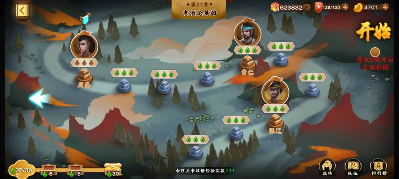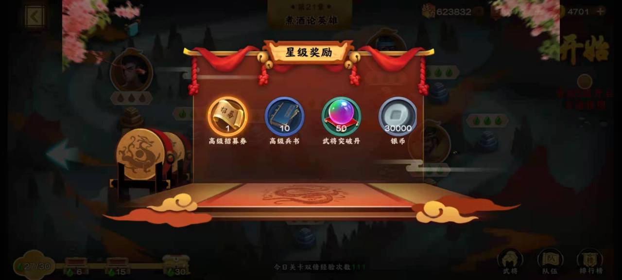 第二件需要做的就是推图,推图是前期获得招募卷,兵书,武将突破丹和银币等强化必须道具的主要途径,也是最简单的一条,只要大家把主力队伍拉起来,推图就很简单了。尤其是多上肉盾和治疗武将,争取拿到三星,这样还能激活关卡扫荡功能和宝箱奖励。之后就是把想要搜集和培养的武将来重点扫荡对应的关卡,很快就能集齐。