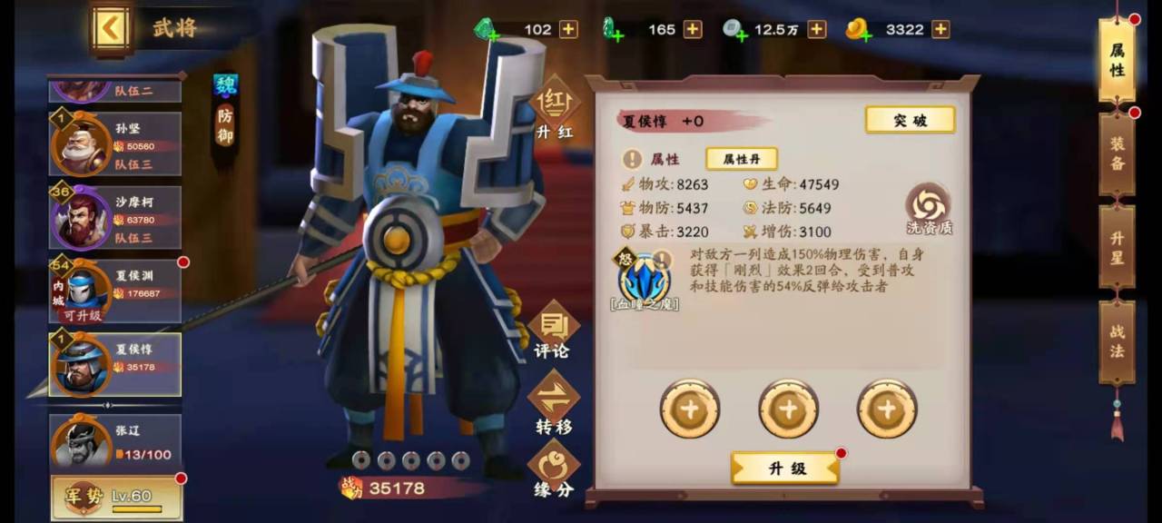 魏国的阵容可选择的武将不少,小编选择的是夏侯惇,夏侯渊,典韦,荀彧,张辽,其中夏侯惇的怒气大招是血瞳之魔,效果是伤害敌方一列的目标,并且自身获得刚烈效果,一旦在刚烈状态受到伤害,就可以反弹一部分伤害给施法者。当激活了秘籍之后,可以增加伤害反射的比例,能达到84%的伤害值。夏侯惇之所以入选,就是伤害反射太厉害了,很多脆皮武将就是被夏侯惇给反射死的。