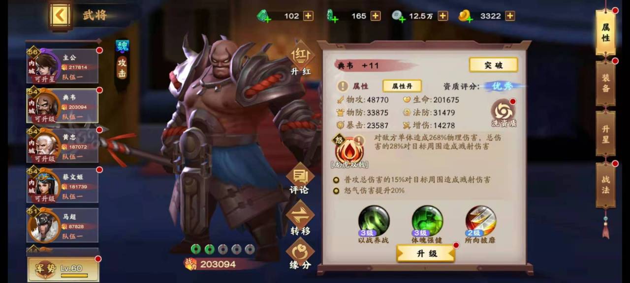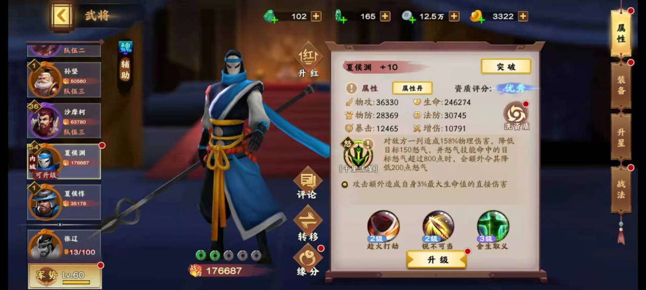 张辽的怒气技能效果是攻击一列敌人,同时为己方群体施加免伤效果,激活了秘籍之后,只要张辽存活,我方武将受到功能时候就能有几率回血,张辽也是半输出半辅助的角色。这一套阵容里,典韦,夏侯惇在前排,张辽,荀彧和夏侯渊在后排。