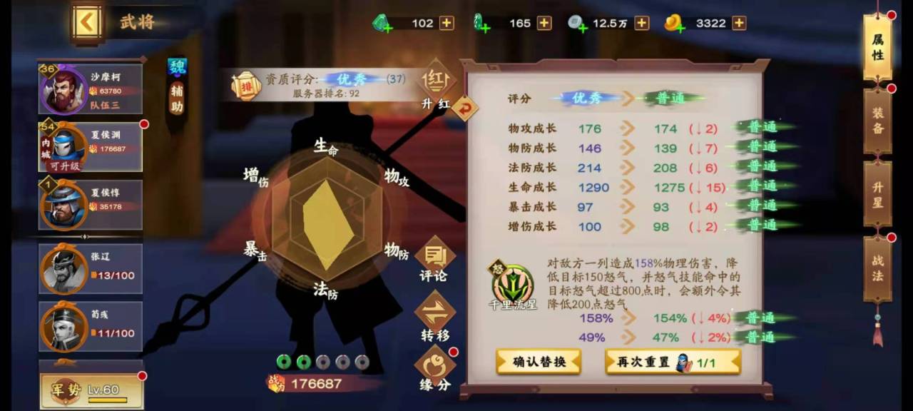 夏侯渊的怒气大招是千里流星,效果是伤害一列敌人,同时降低伤害目标的怒气值,激活了秘籍之后,获得攻击降低怒气的效果,如果伤害目标怒气低于1000的话,怒气越低,则受到的伤害就越高。夏侯渊的特点就是打怒气,延迟一列敌人获取怒气的效率,就相当于减少而来敌方的输出。在后期大家都是靠技能吃饭的,夏侯渊的这个特点在后期才能完全发挥出来。