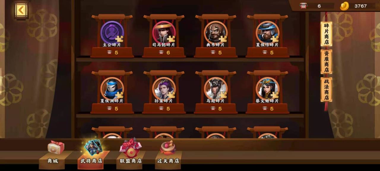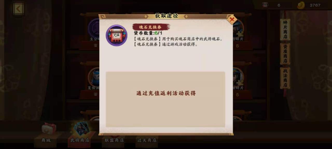 酒馆招募是获取武将魂石最多的地方,消耗元宝或是高级招募卷轴就可以抽取武将,每次都有几率获得武将整卡或是魂石,其中整卡的几率很少,大部分都是魂石。但是获得哪些魂石都是随机的,所以只适合前期使用,后期定点培养的时候就不要再去抽了。在商店之中的武将商店页面,可以通过魂石兑换券来兑换魂石,每5张魂石兑换券可以兑换一枚武将魂石。