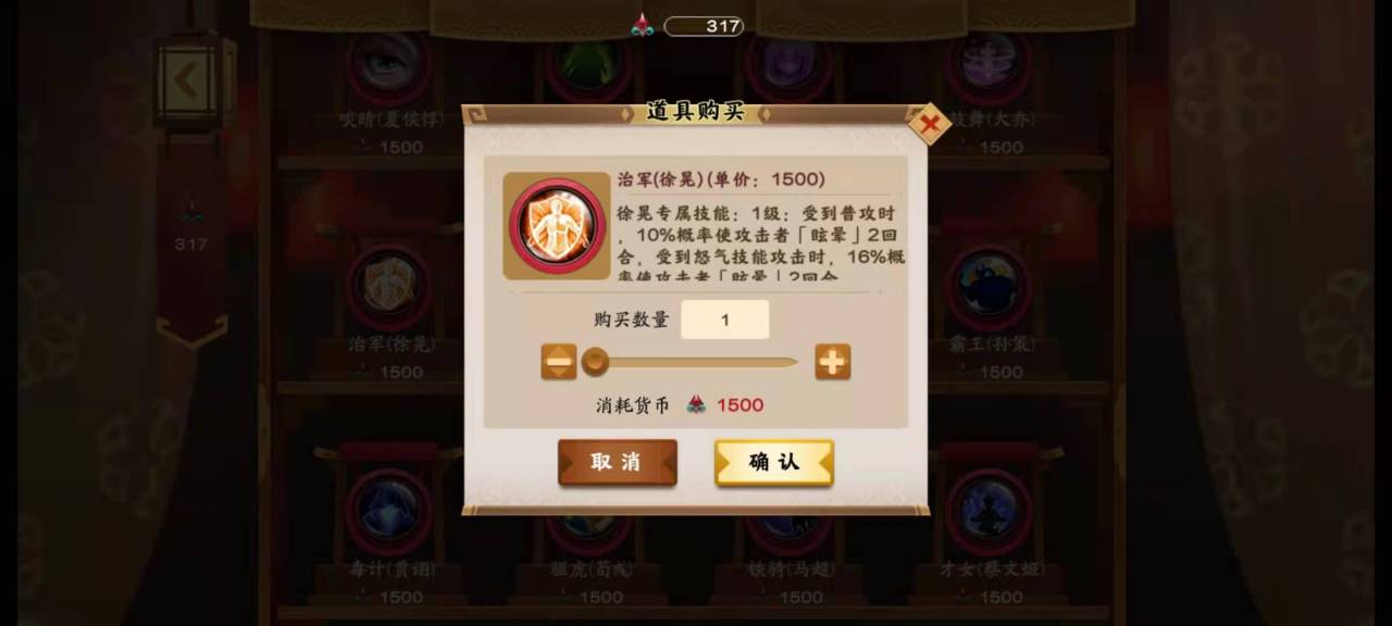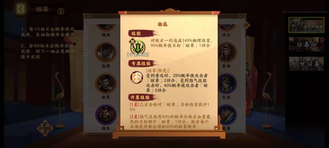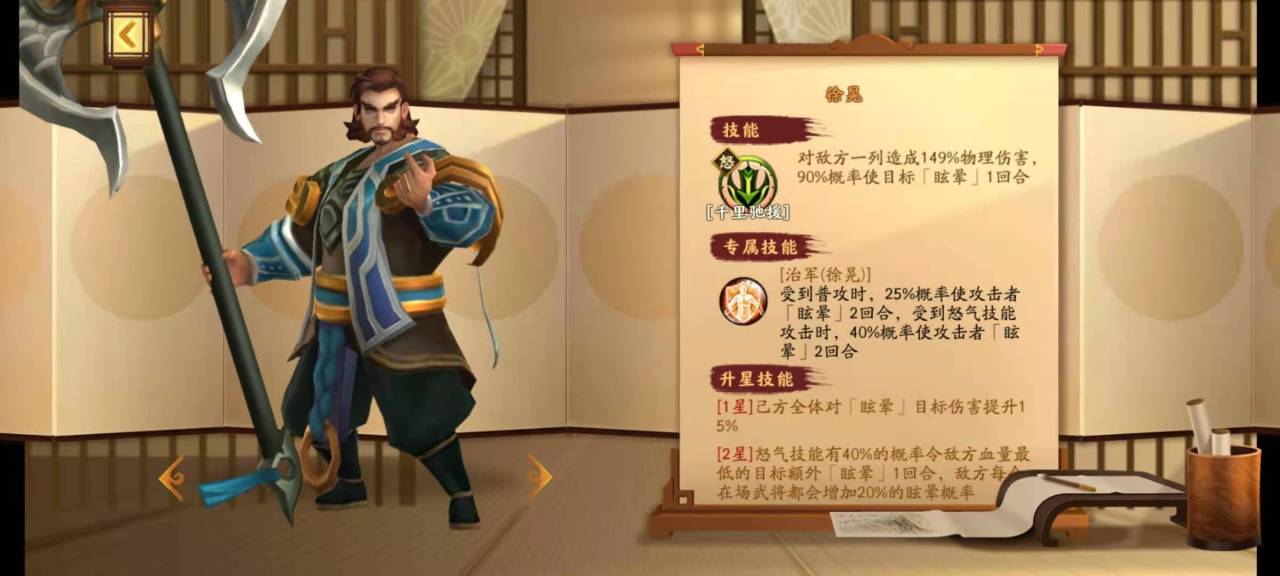 先来看一下徐晃自身的属性,徐晃属于物理伤害类型的武将,在选择技能的时候要以物理伤害为主。徐晃的自带怒气大招是千里驰援,效果是伤害敌方一列的武将,然后有几率使得伤害目标眩晕。徐晃的技能就是伤害加控制的组合,所以在玩徐晃的时候,既可以当做是主力输出来培养,也可以当做是辅助控制来用。