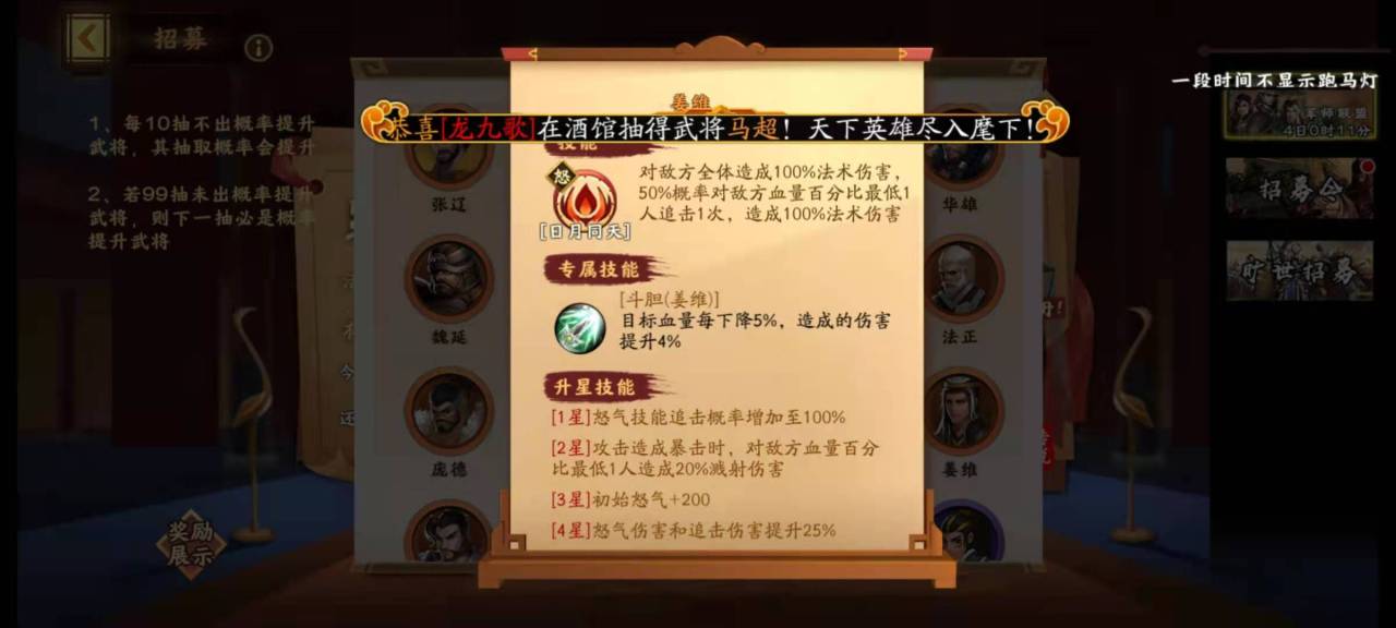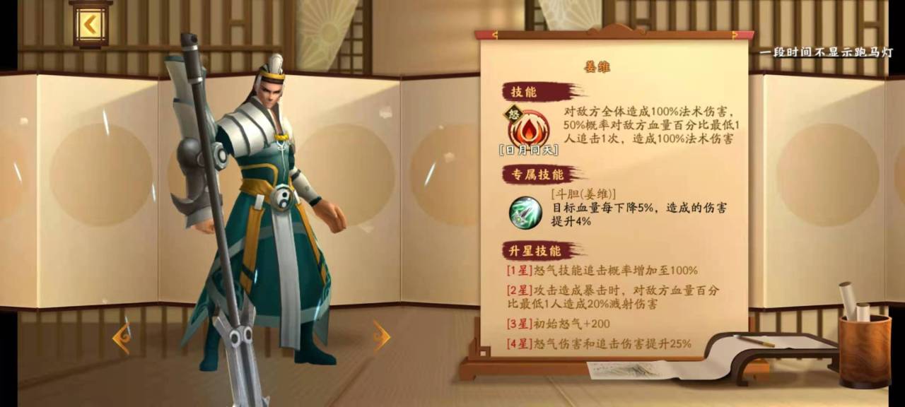 先要搭配和技能就要先了解姜维的属性,姜维在胡莱三国3中被设定成了法术型武将,这多少有一些颠覆大家的认识,所以在搭配技能的时候一定要注意。姜维自身的怒气大招是日月同天,效果是对敌方全体武将造成100%伤害值的法术伤害,同时有50%的概率,对伤害目标中血量最低的一名武将造成一次追击伤害,伤害值也是100%。