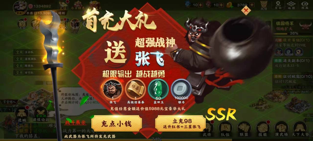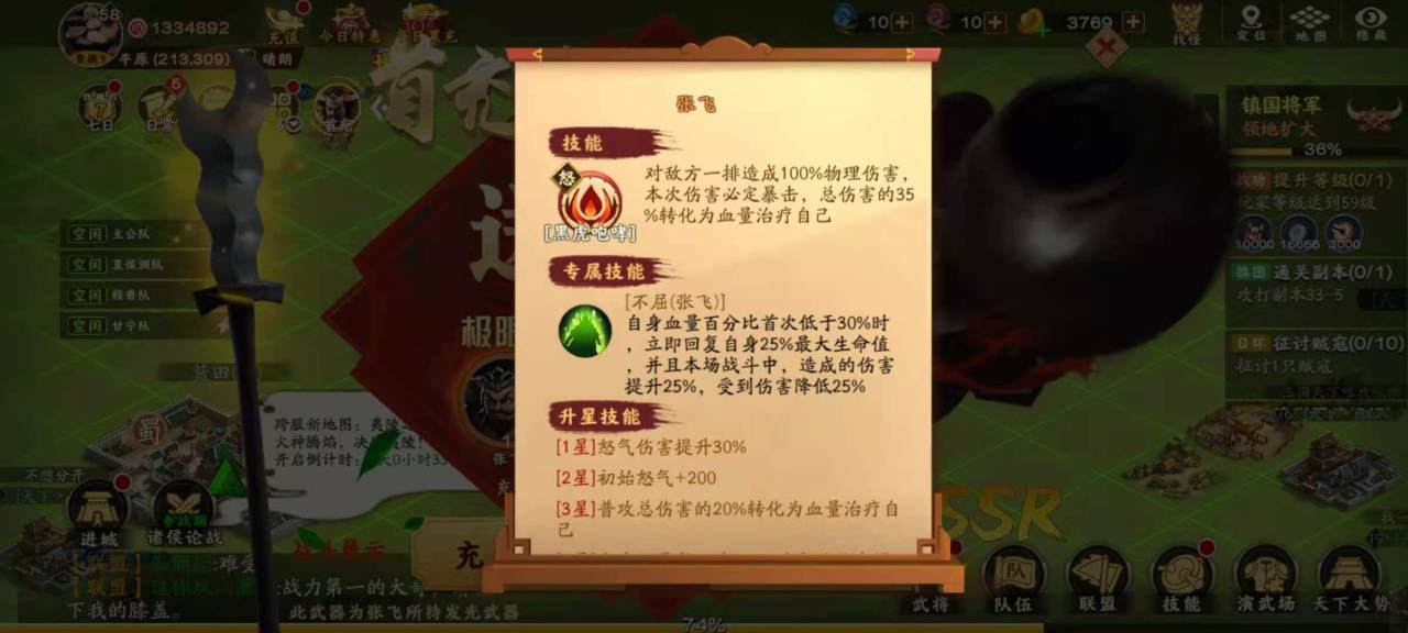 张飞本身属于橙色武将序列,但是在获取途径上和一般的橙色武将不同,张飞属于首充赠送的武将,大家都知道首充一般都是非常超值的,所以作为首充武将的张飞,自然也不会很差。张飞自带的技能是黑虎咆哮,效果是可以伤害一整排的敌方武将,并且技能伤害必定出现暴击,暴击伤害最起码都是在一倍以上的。还有一个效果是打出伤害之后,伤害总量按照百分比可以转化为自己的血量,也相当于吸血了。