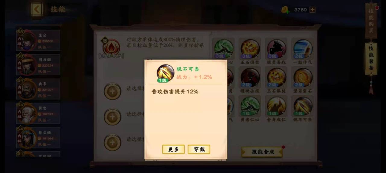 所以在选择技能的时候,要着重注意武力伤害的提高,小编选择的是霸王,骁勇善战和所向披靡,其中霸王是孙策的专属被动技能,效果是在进行普攻之后,可以再额外造成一次伤害,伤害的数值和目标当前的最大血量有关,这个技能用来打肉盾武将非常好用。骁勇善战的效果是直接提高造成的物理伤害,无论是怒气技能或是普攻都可以享受加成。