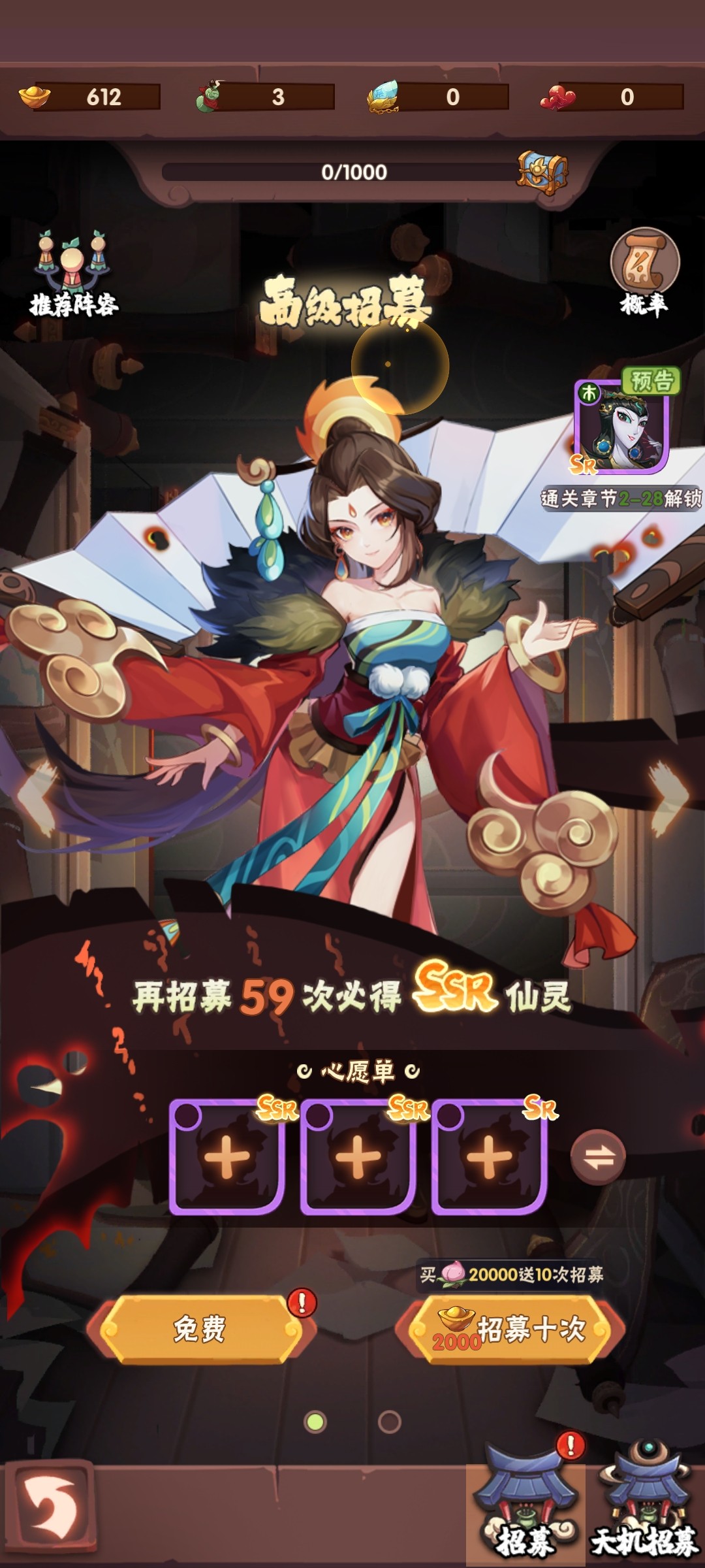 最主要的招募方式玩家们可以从下方的选项中选择主城,进入主城之后选择仙灵台,然后我们可以看到普通招募60次可以获得一个SSR仙灵并且可以在心愿单中选择自己想要的SSR仙灵,每天我们都有免费招募次数,也可以花费元宝和购买仙桃获得招募次数!另外玩家们在右上角可以看到我们招募仙灵的概率,在这款游戏中仙灵招募的概率都是公开的!