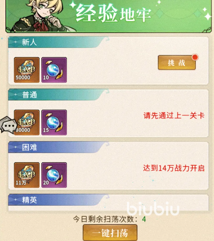 除了推图养卡外,这里还有各种特色玩法,首先是“丰饶地牢”可以通过探索地牢拿到海量资源,通过一关后还可以进行扫荡,每一类副本的扫荡机会完全独立,可以直接拿到通关关卡的奖励,免费扫荡机会消耗完后也可以消耗钻石来扫荡,然后是“藏宝图”在这里可以寻找蛇灵赠予的宝藏,通关也能拿到奖励,每张宝藏图会有4个线索组成,每一个线索上有10个据点,战胜据点就能拿到奖励,完成所有线索可以通过消耗钻石购买蛇灵;