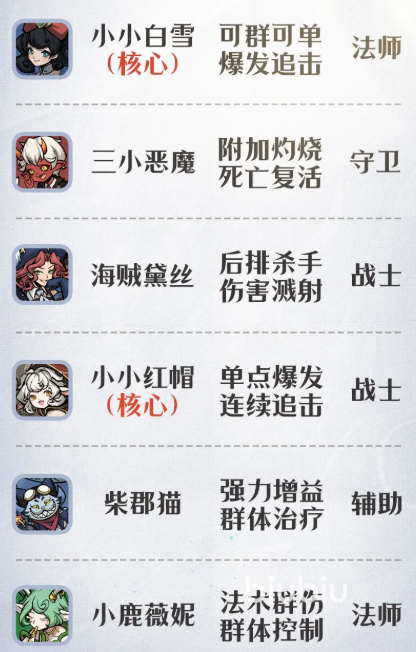 海贼黛丝作为战士却带有切后排能力,可以压低敌方关键输出的血线,为白雪锁定低血目标,同时自身的溅射伤害也能打出不俗的输出,小鹿薇妮除了有法术群伤还有群体控制效果,能辅助白雪输出,红帽有着极强的单点爆发,并且同样带有击杀追击能力,可以帮助补刀,三小恶魔作为守卫,带有死亡复活能力可以在前排抗下不少伤害,柴郡猫有着群体治疗的同时还能够为己方提供暴击加成等增益效果。