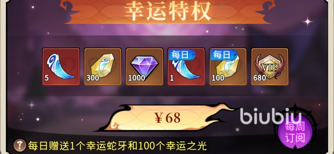 幸运特权:68元,每日能拿到1幸运蛇牙和100幸运之光(用于蛇灵转换),每次购买后特权效果持续7天。