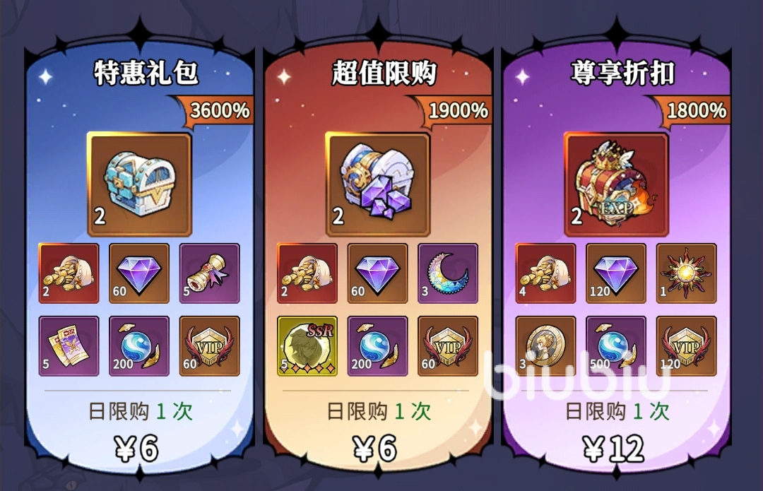 每日礼包:12元召唤礼包>30元进阶礼包=30元史诗结晶礼包>68元盲盒召唤礼包=68元特惠召唤礼包>其它礼包。