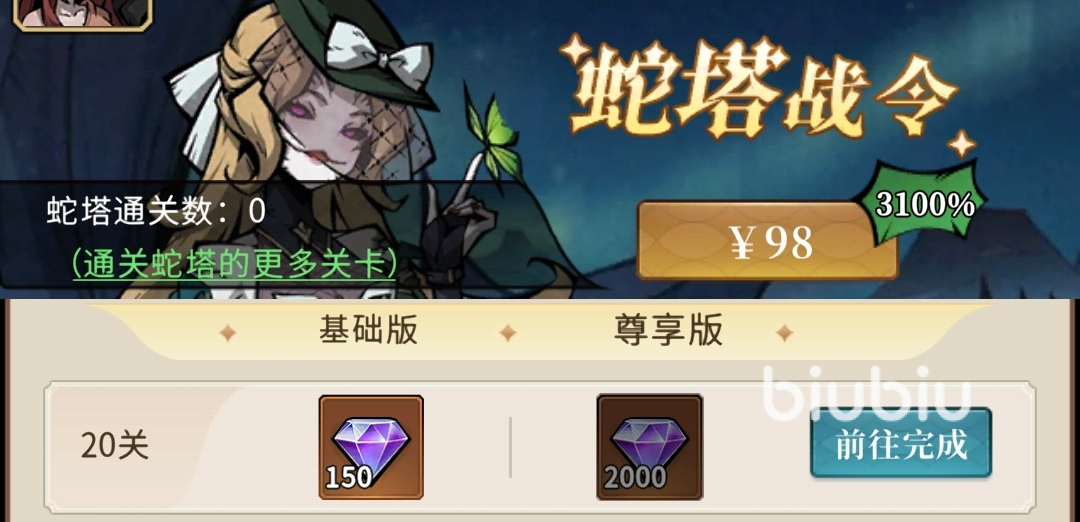 蛇塔战令:98元,在蛇塔里通关目标层数后可拿到钻石奖励,最高能获得31000钻。