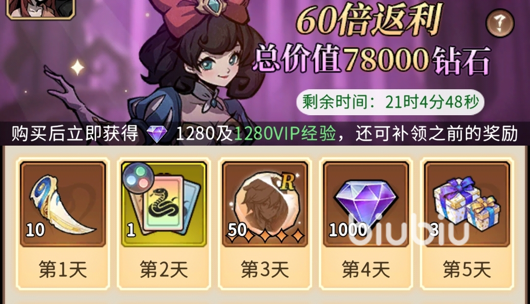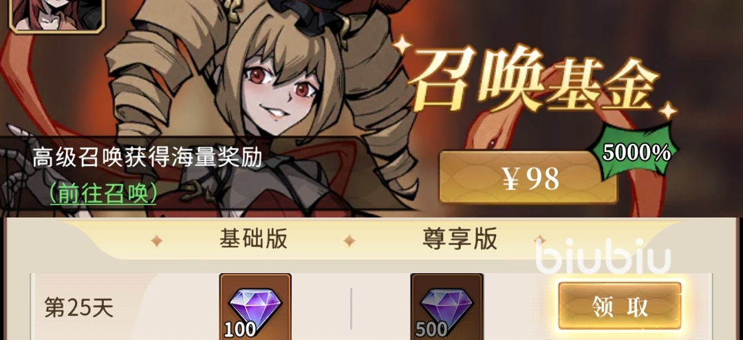 召唤基金:98元,累积在线达到目标天数后,就能领取大量钻石、蛇牙。