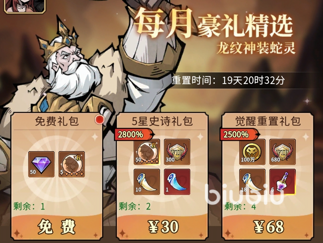 蛇王秘宝:每种礼包只需购买5次,往后便能每天免费领,长期玩收益高。建议冲榜玩家和霸服大佬全买,全部礼包共计需花费108元,月卡党和战令基金玩家用来累计消费金额激活月卡。