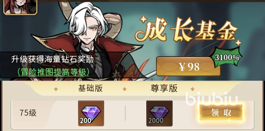 成长基金:98元,将等级提升至目标等级后就能领取钻石奖励,解锁后总共能获得31000钻石。