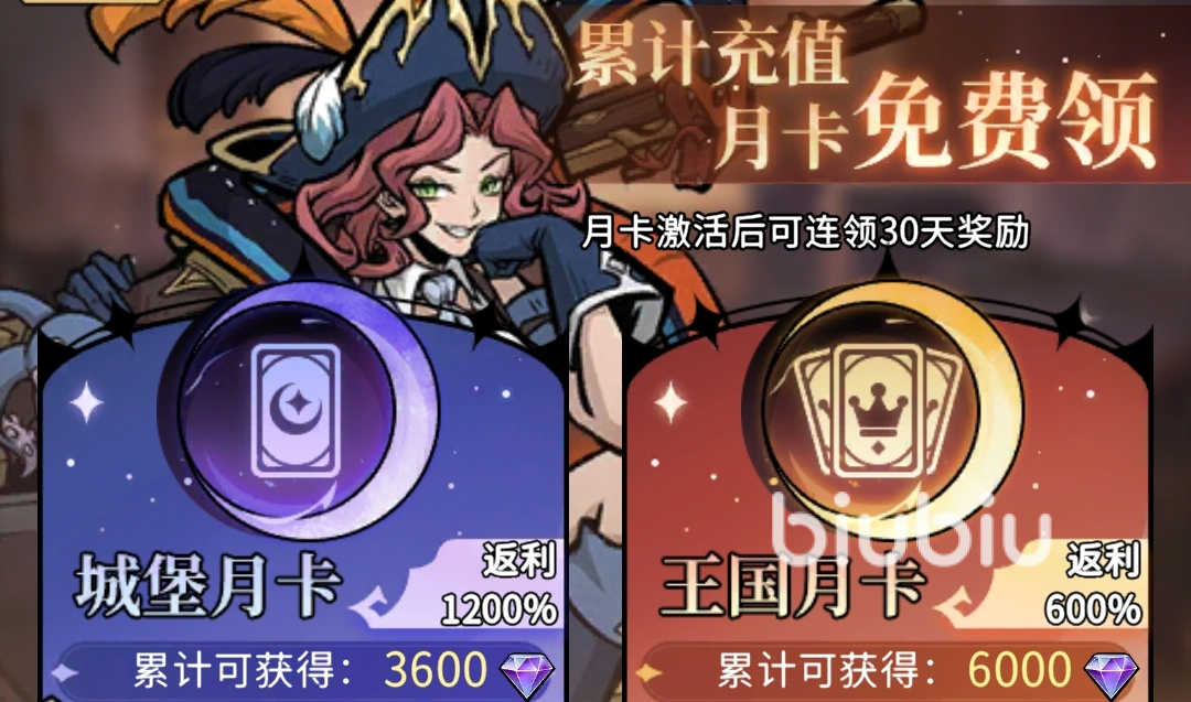 月卡:游戏有城堡月卡和王国月卡两种,可在购买其它项目时开启,其中城堡月卡需累计买满30元激活,每天能领120钻,王国月卡需累计买满90元激活,每天能领200钻。