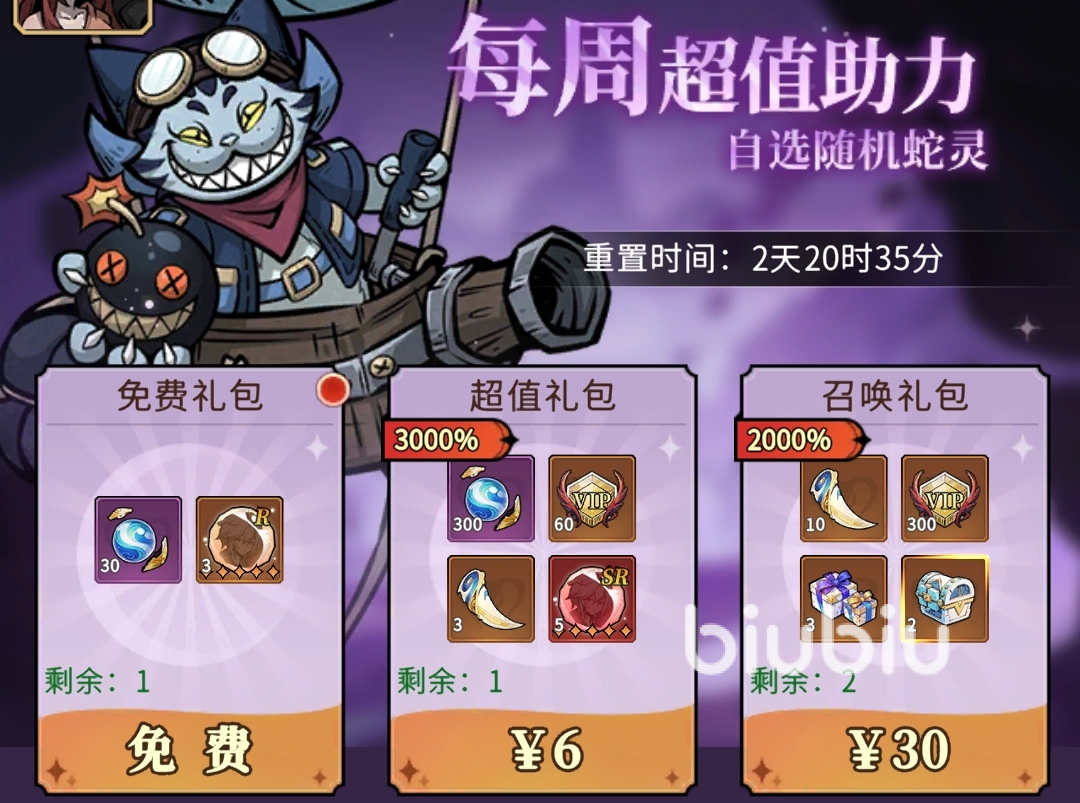 每周礼包:6元超值礼包>30元召唤礼包>68元召唤礼盒>198盲盒礼包=198传说龙纹礼包=198传说魔兽礼包>648元稀有资源礼包=神话龙纹礼包=神话魔兽礼包>其它礼包。