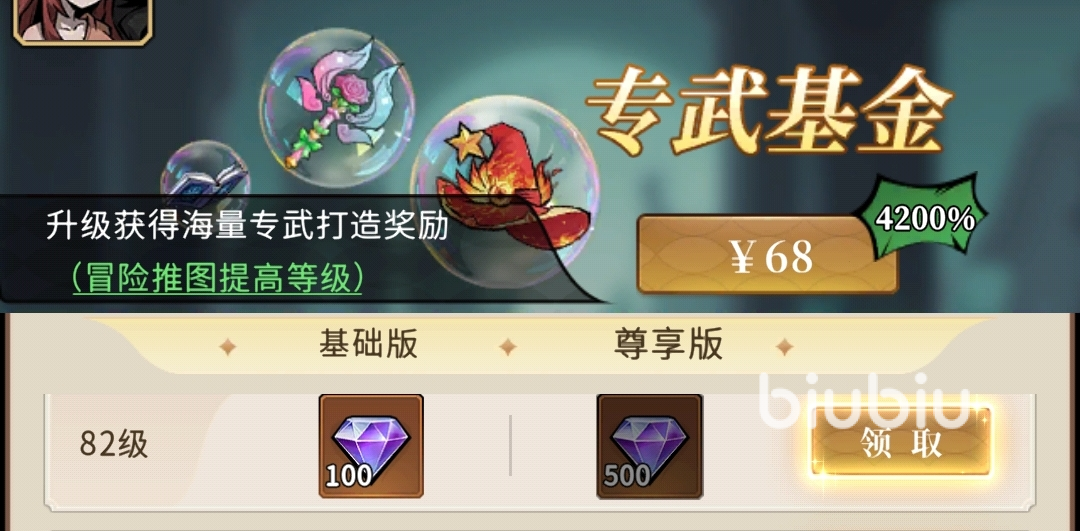 冒险特权:68元,购买后每天能获得进阶晶球、蛇灵经验等奖励,一次购买终身生效。