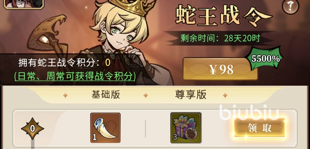 蛇王战令:98元,累积蛇王战令积分获取奖励,能拿到蛇牙、神话结晶自选箱、养成资源等奖励。