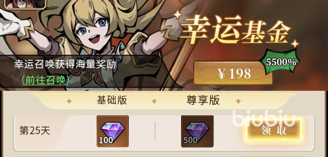 幸运基金:198元,与幸运召唤有关的基金,同样需累积在线达到目标天数后才能领将,能拿到钻石、幸运蛇牙、蛇牙等奖励。