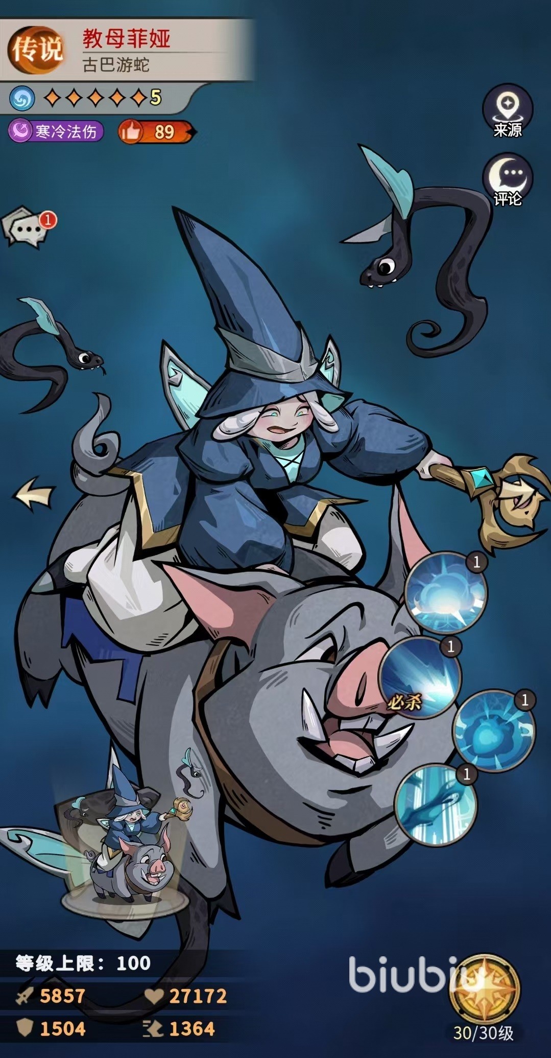 教母菲娅的定位是法师职业,它可以造成寒冷法术伤害。一技能仙灵术,随机选择三个目标附加法伤,有几率施加寒冷和冰冻。该技能强化之后,伤害系数提升冰冻和寒冷的触发几率提升。对方被寒冷后防御降低,速度降低,最多叠加5层,被冰冻后持续一回合无法行动。所以此技能的伤害尚在其次,对敌方造成的影响和控制才是最主要的。