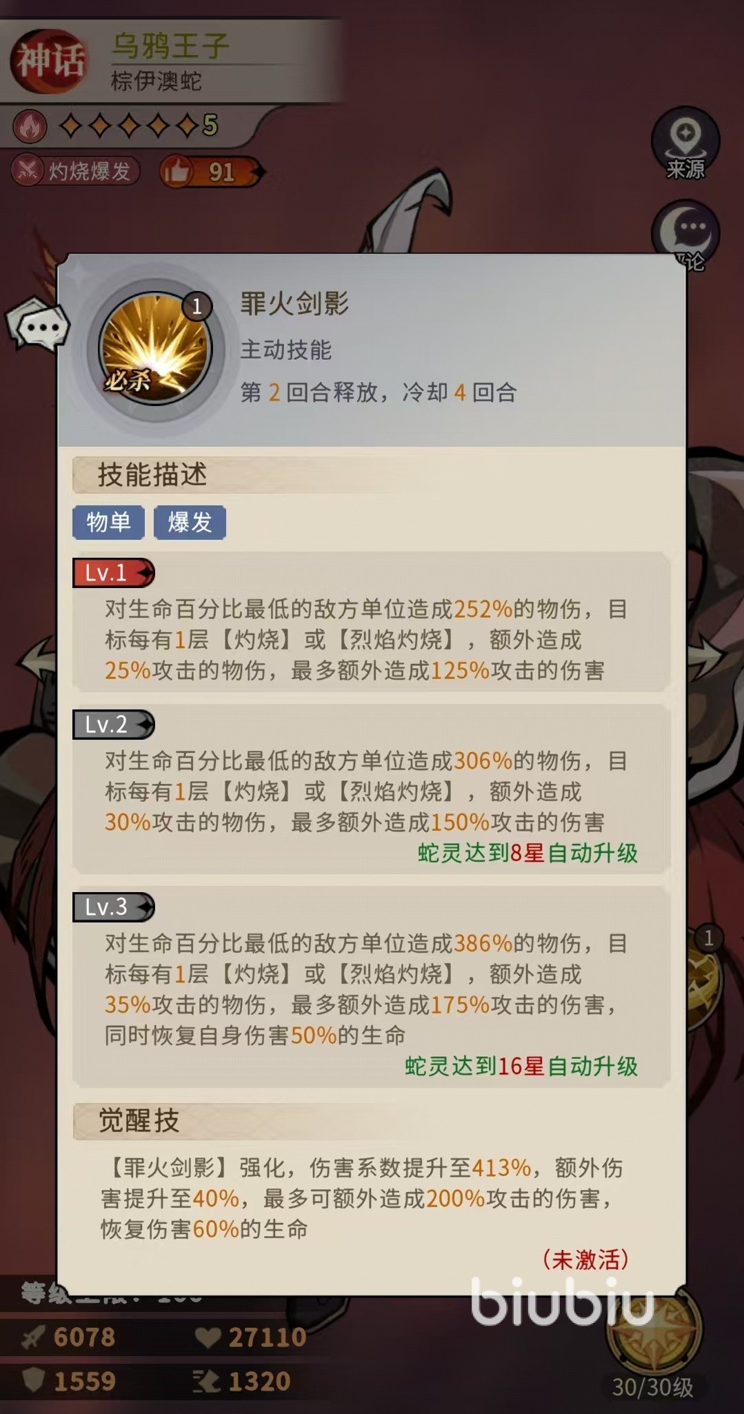 乌鸦王子的技能特点是具有灼烧爆发能力,第一个主动技能可以对敌方前中排造成物理伤害,有几率施加灼烧,如果目标血量低于半血,额外提升暴击伤害。另外该技能在升级之后,对低血量目标和带有灼烧以及烈焰灼烧的单位,都有额外的伤害加成。对方被灼烧影响之后,每回合会损失乌鸦王子15%攻击力的生命值,最多可以叠加5层。第二个主动技能是对敌方生命百分比最低的目标附加物理伤害,目标身上带有灼烧或者是烈焰灼烧层数,都可以额外附加输出,同时能够恢复自身的生命值。