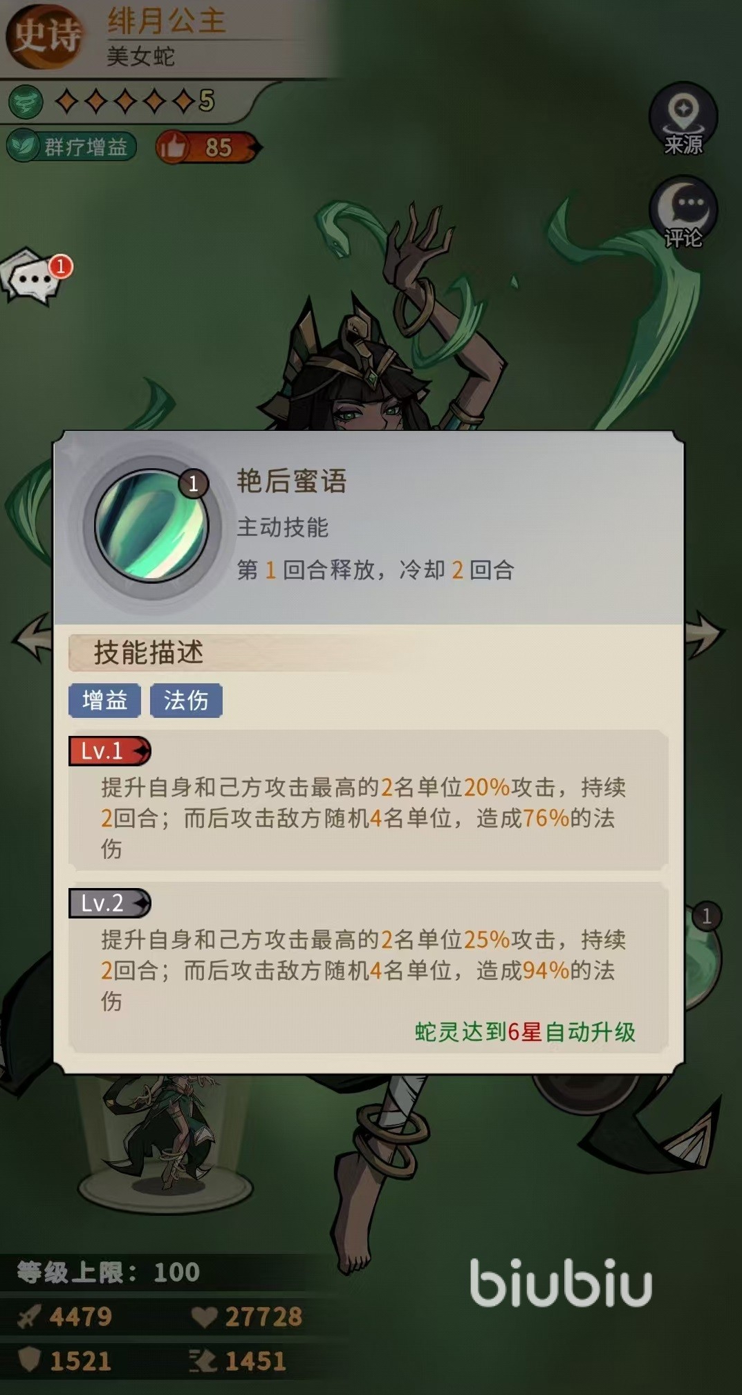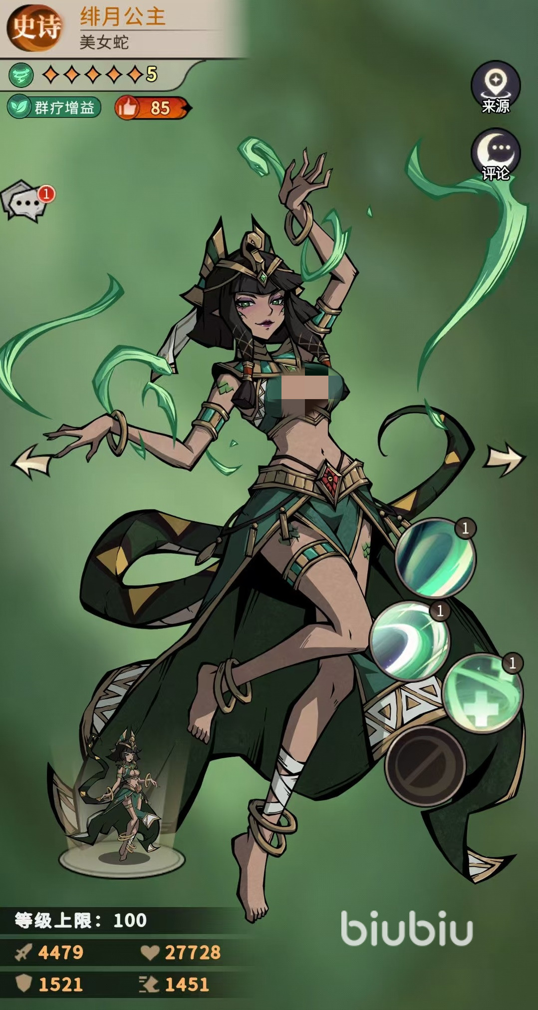 首先在自身品质方面,绯月公主是属于史诗级的角色,从这一点来看,相比于其他的神话要略逊一些,不过自身的定位是辅助职业,可以带来群体治疗和各种增益状态,这就使得它的更换需求并不大。看一下技能效果,一技能可以提升自身和己方攻击最高的两个目标25%的攻击力,持续两回合,随后对四个随机目标造成伤害。第二个技能为己方生命百分比最低的两个单位恢复生命值。还有一个被动效果,最多能提升20%的生命和10%的攻击。