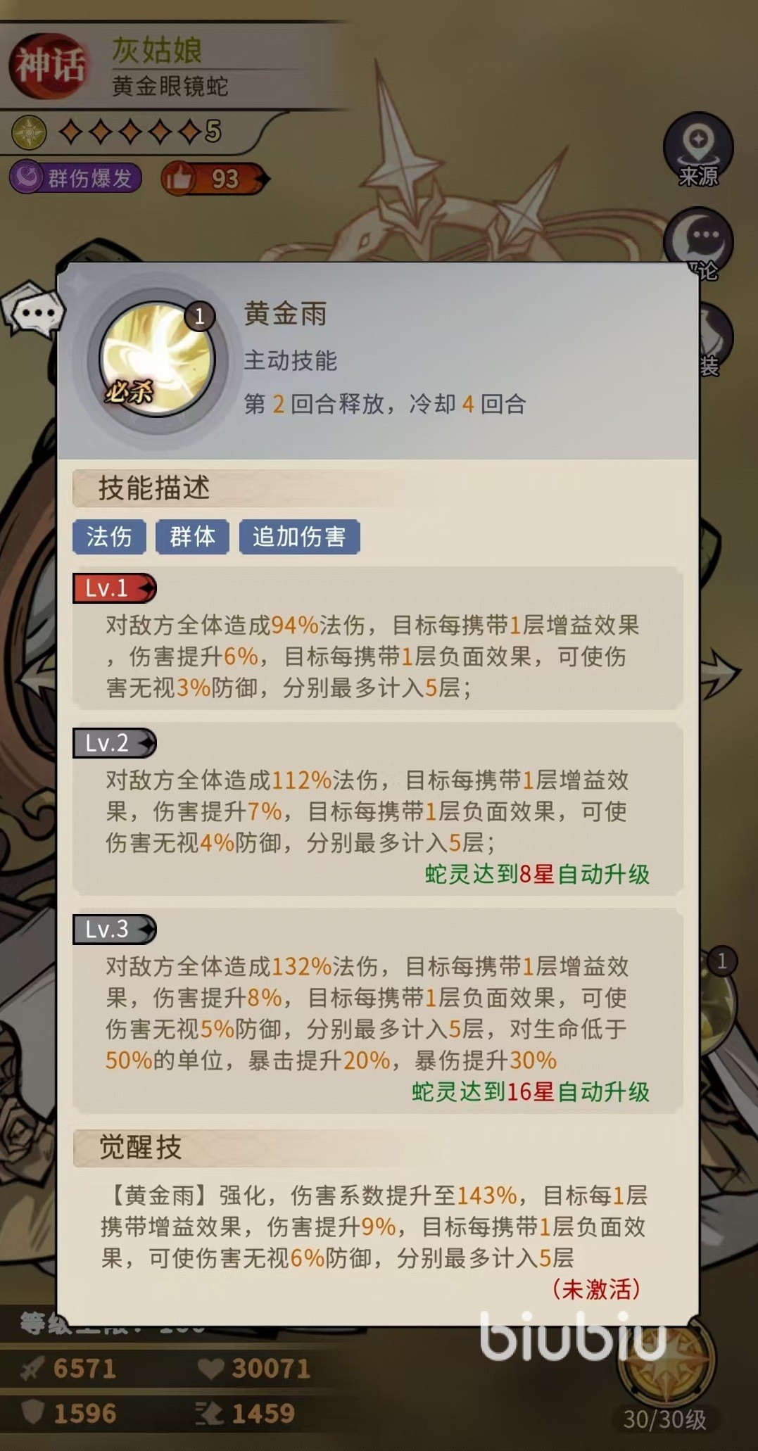 在游戏的定位中,灰姑娘是属于群伤爆发类型,她作为神话角色拥有两个主动技能和两个被动,在属性方面就要比其他的角色更强一些。先来简单看一下技能特点,主动技能星光璀璨,对敌方全体造成高额法伤,伤害由所有的目标共同承担,还有几率给目标附加日蚀效果。对方被影响后攻击和命中都会大幅度降低。觉醒之后该技能获得强化伤害系数提升,对攻击低于自身单位造成的伤害提升。第二个主动技能,继续对敌方全体造成法术伤害,目标身上携带的增益效果越多,伤害加成就越高,携带的负面效果越多无视防御百分比越高。
