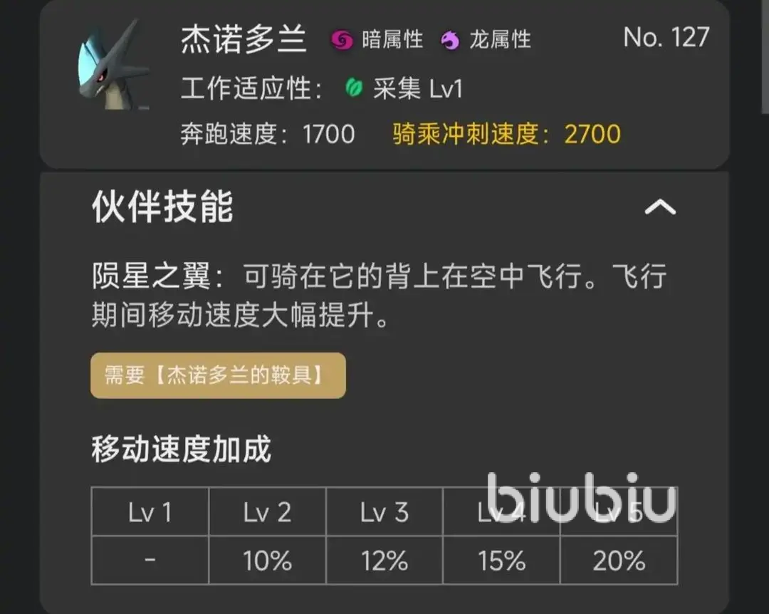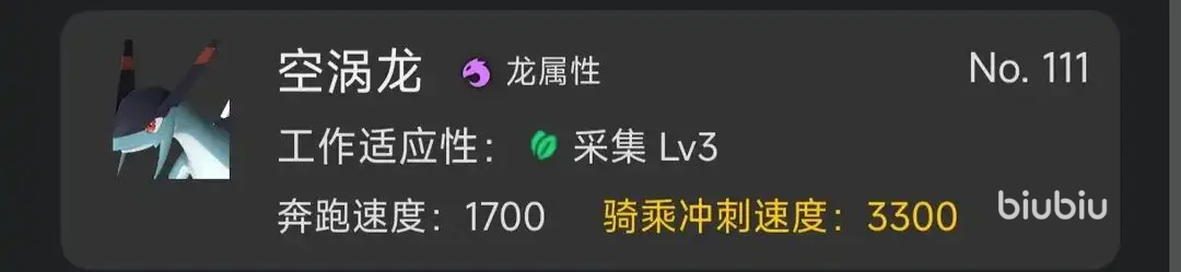 第二个杰诺多兰,基础冲击速度虽然比空涡龙要略微低一些,但是它拥有伙伴技能的加成,在满星的情况下,冲刺速度和前者是不相上下的,而且它的耐力值是300,基本就是空涡龙的3倍,也就是说它能飞行更长时间,不过获得相对比较靠后。