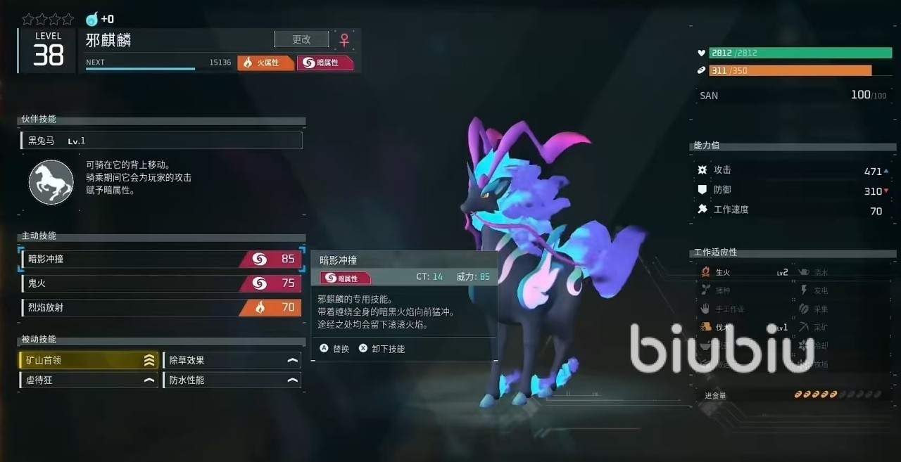 在幻兽帕鲁中,邪麒麟是一种很强大的宠物,它具有火暗双属性的特点。在捕捉的时候要注意,必须等到晚上才会出现在地图中的蓝色火山区域。找到一些频率比较高的刷新点蹲守就可以直接去捕捉了。注意捕捉的时候应该绕到背后进行攻击,将其打到残血后使用高等级的帕鲁球,以提高捕获成功的几率。火麒麟的核心能力是黑马兔,特点是可以直接骑在斜行的背上移动,在骑乘期间,玩家的攻击将会赋予暗属性,这一点在实战中有着很重要的作用。