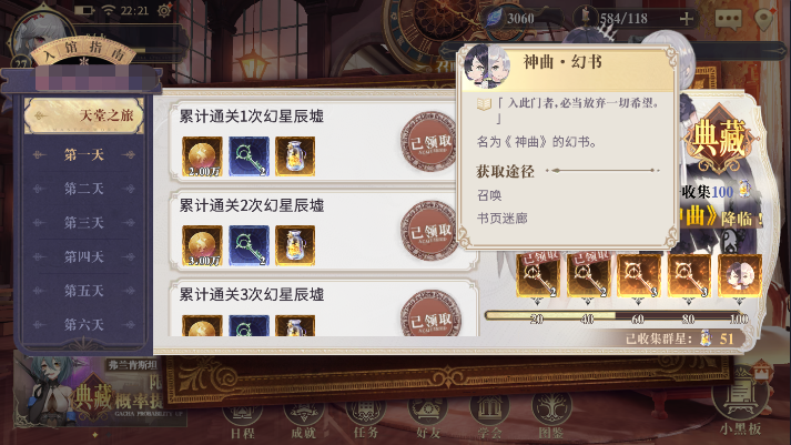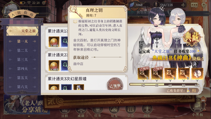 2、总积分20领取2个真理之钥、总积分40领取2个真理之钥、总积分60领取3个真理之钥、总积分80领取3个真理之钥、总积分100领取典卡《神曲》。