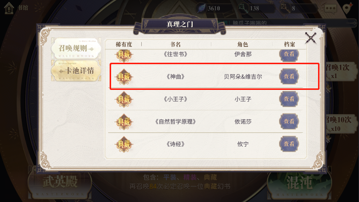 2、藏书家的目录:玩家可以把贝阿朵莉切放在“藏书家的目录”里面,这样《神曲》的获得召唤概率将会得到提升。有这个UP加成的角色在抽到典藏卡的时候,将会有额外40%几率得到《神曲》。