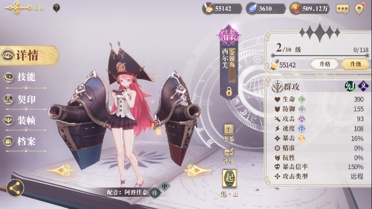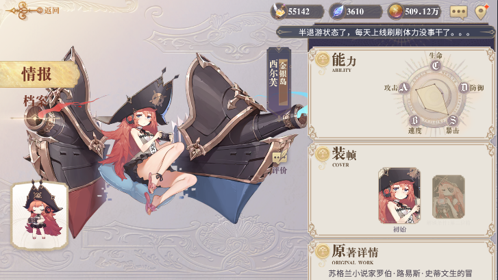 1、角色信息:希尔芙《金银岛》是群攻(大范围)系角色,初始品质为精装SR卡。