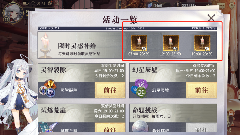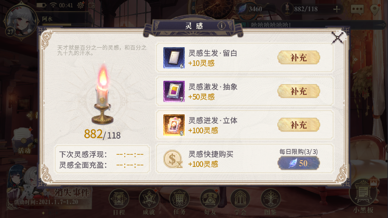 2、任务活动:完成任务和活动可以得到大量的灵感进发,不过小编不建议大家一次全都都给用了,最好等待活动或者高等级的时候再去使用,这样性价比会高一些。
