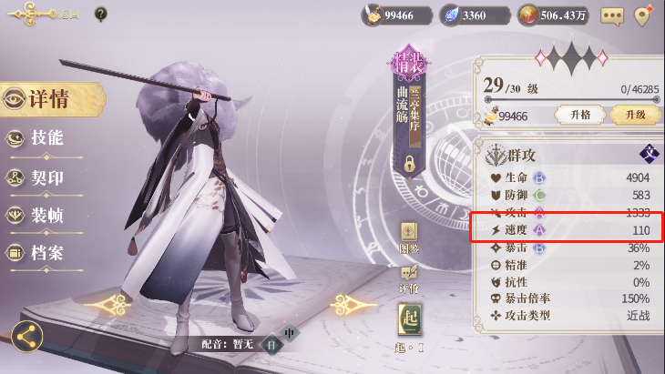 1、在角色的属性栏里面玩家可以看到觉得基础属性值,这个属性一般情况下是无法改变的,并且每个角色的初始属性都不一样。速度属性的大小是英雄角色出手速度的关键。