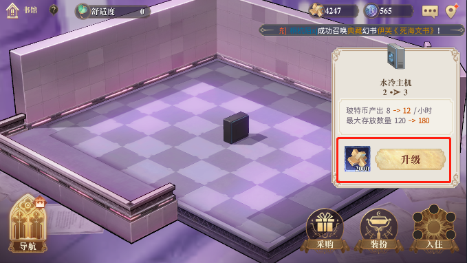 2、增加房屋角色数量之后可以提升书界奇物所增加的效果,因此水冷主机是一个非常重要的道具。增加舒适度还有一个作用是,可以出发额外剧情,观看剧情后系统会赠送大量道具。