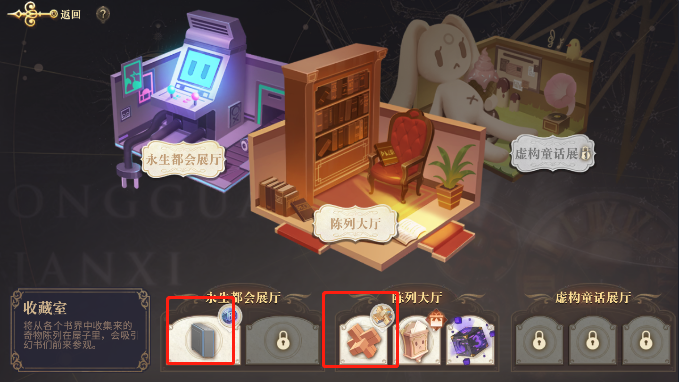 3、如何升级:首先进入到游戏主页面的位置,点击左上方的“一盏灯”进入收藏夹系统。左边的永生都会展厅是升级和使用“水冷主机”的地方,中间的陈列大厅是升级和获取“榫印”的地方,小编已经在图中为大家标记出来了。在进入永生都会展厅后在中央位置显示一个“主机”,点击即可升级;在进入陈列大厅后在右下角位置显示一个“木头”,点击即可升级。
