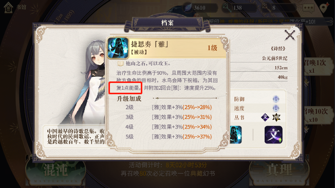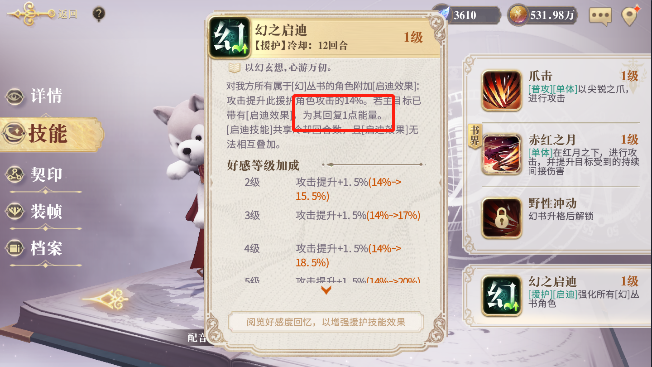 2、援护的技能类型较多,其中可以恢复能量的援护技能有六个种类,分别是幻之启迪、神之启迪、智之启迪、文之启迪、术之启迪、幻书精研。每一种援护技能对应着一种类型的角色,只有指定类型才能恢复能量。