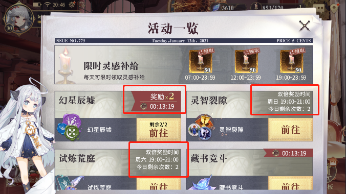 2、翻倍奖励:幻星辰墟双倍奖励时间周一到周五,时间为19:00—21:00;灵智裂隙双倍奖励时间周日,时间为19:00—21:00;试炼荒庭双倍奖励时间周六,时间为19:00—21:00。