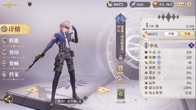 2、罗宾:优先属性为暴击几率>攻击力>速度值。契印推荐天子的受命。