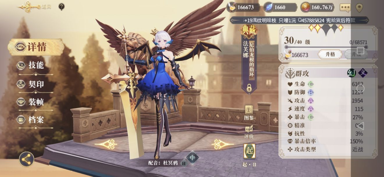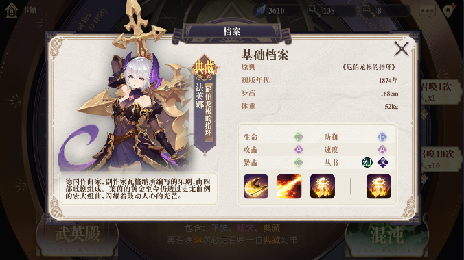 4、法芙娜:优先属性:暴击几率>攻击力>速度值。契印推荐圣子的救赎。