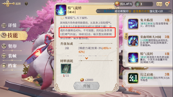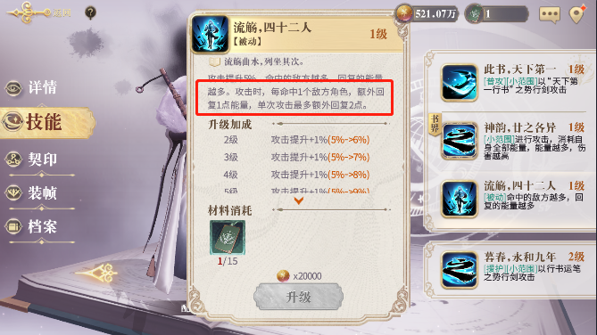 1、衷曲明断儿回闻:这个技能的基础伤害中规中矩,但是每有一层充能就可以提升将近一倍的伤害,因此是游戏中的最强爆发群攻技能,不过和大多数的技能不一样。这个技能需要四点能量才能使用,游戏初始两个能量加上契印回复的能量,这样别人就能释放技能,而婴宁却只能进行普通攻击操作。