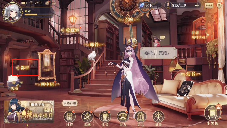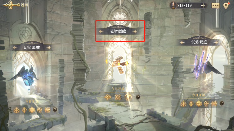 2、如何进入:首先玩家将游戏进入到主页面位置,点击最左边的“都市”按钮。在都市中点击“虚空书界”,中间的灵智裂隙就是获取殷商的龙骨的地方。